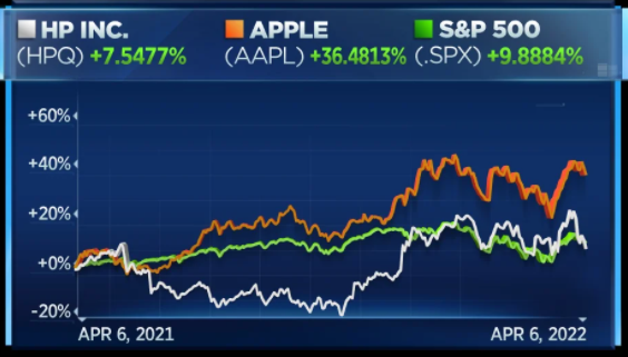 虽然苹果仍在稳步增长,但惠普更多的是一只价值型股票。周四之前,该公司的预期市盈率约为8倍,而标普500指数的市盈率约为21倍,苹果的市盈率为27倍。截至周三收盘,惠普股价过去一年上涨了7.5%,落后于苹果36%的涨幅和标普500指数10%的涨幅。