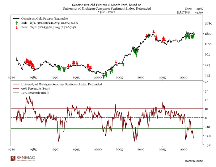 “我们没有发现通胀、实际利率、货币供应或任何其他理论对黄金期货回报有多大影响。不过,我们认为消费者信心是一个合理的因素,信心高企会导致未来回报疲弱,而信心不足则会导致多头受益,”Renaissance Macro Research创始人Jeff deGraaf在报告中表示。