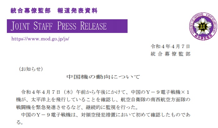 FX168财经报社(香港)讯 日本防卫省4月7日表示,7日发现一架中国的运-9通信对抗机飞航在冲绳南方的太平洋上空,日本自卫队战机紧急升空因应。这是日本首度对同型机采取因应领空遭侵犯措施。