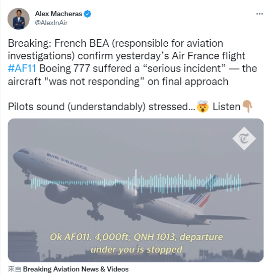 驾驶舱音频显示飞行员正在努力让波音777着陆,空中交通管制员和一名飞机飞行员之间的无线电通信,首先由行业新闻网站AirLive发布,此后已由法国航空安全调查局(BEA)向美国美国有线电视新闻网(CNN)进行验证。