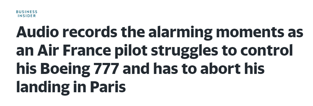 FX168财经报社(香港)讯 马航波音客机刚经历紧急坠落7000英尺,法国波音客机接续再出事,出现降落时失去控制的状况。法航飞行员努力控制波音777,并且不得不中止在巴黎降落时的音频曝光。法国民航局声明,已快速展开调查行动。