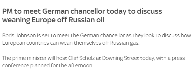 报道预计,约翰逊先生将向严重依赖俄罗斯天然气的柏林提供援助,以减少其对莫斯科能源出口的依赖,以使普京的战争机器资金匮乏。