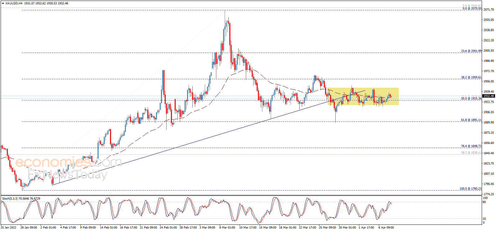 金价在过去几个交易日呈现横向波动态势。值得注意的是,目前随机指标传递负面信号,等待这一因素推动金价在日内继续看空趋势,下一主要目标位于1890.00美元/盎司。