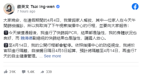 蔡英文8日晚间在脸书上发文称,4月4日她曾与家人餐叙,其中一位家人在8日午间筛检确诊,所以她取消了8日下午视察指挥中心的行程,“接获通报后,我进行了快筛与PCR,结果都是阴性,我的身体状况也良好”。