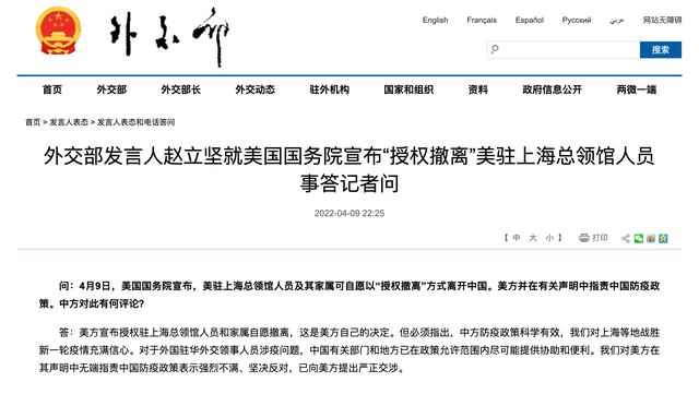 FX168财经报社(北美)讯 据外交部官网周六(4月9日)消息,中国外交部发言人赵立坚就美国国务院宣布“授权撤离”美驻上海总领馆人员事答记者问。