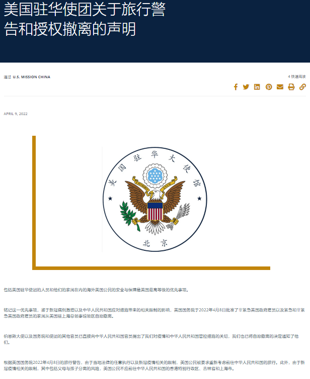 美国驻华大使馆网站周六发布消息,鉴于新冠病例激增以及中国应对措施带来的相关限制的影响,美国国务院于2022年4月8日批准了非紧急美国政府雇员以及紧急和非紧急美国政府雇员的家属从美国驻上海总领事馆领区自愿撤离。