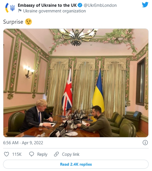 周六早些时候,乌克兰领导人的办公室和乌克驻英国大使馆公布了两人隔着桌子聊天的照片。