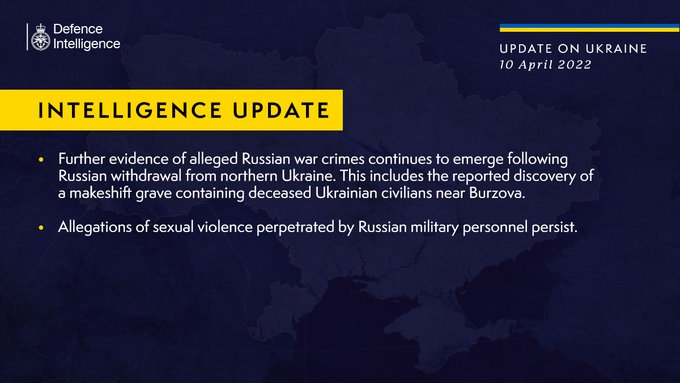 英国国防部在其最新的情报更新中表示,在俄罗斯军队从乌克兰北部撤军后,有关俄罗斯战争罪行的进一步证据继续出现。他们写道:“这包括据报道在布尔佐瓦附近发现了一座临时坟墓,里面有已故的乌克兰平民,关于俄罗斯军事人员实施性暴力的指控仍然存在。”