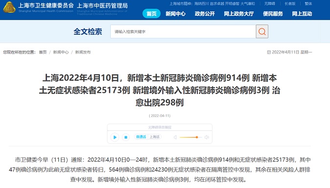 FX168财经报社(香港)讯 根据上海市卫健委4月11日最新通报, 2022年4月10日0—24时,新增本土新冠肺炎确诊病例914例和无症状感染者25173例,其中47例确诊病例为此前无症状感染者转归,564例确诊病例和24230例无症状感染者在隔离管控中发现,其余在相关风险人群排查中发现。新增境外输入性新冠肺炎确诊病例3例,均在闭环管控中发现。