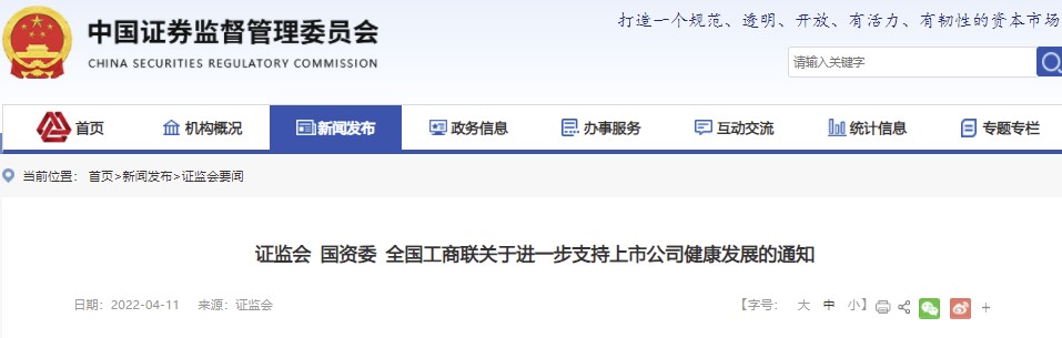 FX168财经报社(北美)讯 中国A股周一(4月11日)遭遇大跌,同日,根据中国证监会网站消息,证监会、国资委、全国工商联发布《关于进一步支持上市公司健康发展的通知》。