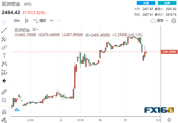 现货钯金一度上涨超4%至2541.82美元高点,现回落至2464美元一线交投。