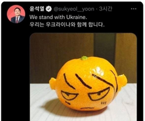 在总统竞选期间,尹锡悦在社交平台SNS上传了一张橘子的照片,橘子上画着愤怒的面孔,并写道“我们与乌克兰站在一起(We stand with Ukraine)”。照片中,橘子两侧有用橘皮做的耳朵,橘子上画着瞪着双眼的面部形象。该照片引发争议,随后被删除。