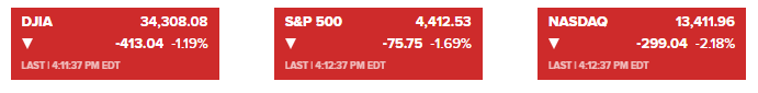 美市尾盘,美股跌幅迅速扩大:道琼斯指数下跌413.04点或1.19%,收报34308.08点。以科技股为主的纳斯达克综合指数下跌2.18%,收报13411.96点。投资者认为,加息对成长型股票的冲击最大。继上周下跌后,标准普尔500指数周一下跌1.69%,收报4412.53点。