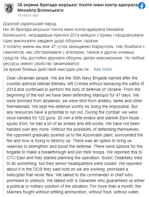 信息的结尾是:“亲爱的乌克兰人民,我不知道接下来会发生什么,但我恳求你用一句好话记住海军陆战队,无论事情如何发展,不要说海军陆战队的坏话。本旅官兵已经竭尽全力,做了所有可能和原本以为不可能的事情”,“我们永远忠诚”!
