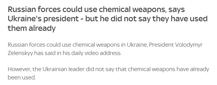 泽连斯基强调,俄罗斯军队可能已经在乌克兰使用化学武器,但是他没有说已经使用了化学武器。今天早些时候,据天空新闻(Sky News)消息披露,有未经证实的报道表明,在袭击南部港口城市马里乌波尔时采用化学武器。