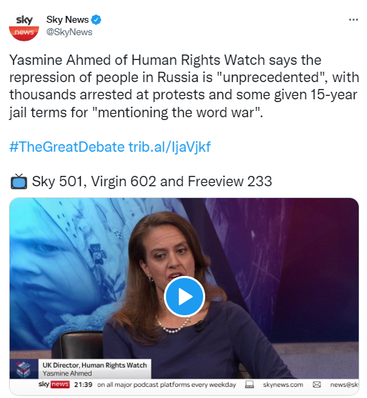 人权观察主任告诉天空新闻,俄罗斯现在的情况是“几十年来最糟糕的镇压”。人权观察组织(Human Rights Watch)主任亚斯敏·艾哈迈德(Yasmine Ahmed)告诉天空新闻,俄罗斯现在的情况是“几十年来最糟糕的镇压”。