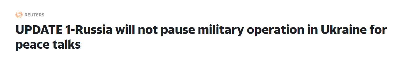 他指出说,目前没有不和乌克兰对话的理由,但莫斯科也不会因此停止在乌克兰的特殊军事行动。他提到,普京总统曾在2月底第一轮谈判时下令停止进攻,但之后莫斯科的立场已不同,“就在我们明白乌克兰不打算给予回应后,只要没有达成最终协议,军事行动就不会停止。”