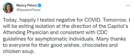 FX168财经报社(香港)讯 美国众议院议长佩洛西(Nancy Pelosi)在11日通过推特证实,她已从感染新冠病毒中康复,检测呈阴性将在12日解除隔离。至于因确诊而延后的亚洲行,她则未说明延期到何时。而在访问前,佩洛西遭质疑正进行美股内幕交易。