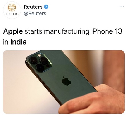 FX168财经报社(香港)讯 苹果公司(Apple Inc)当地时间周一(4月11日)表示,已开始在印度生产iPhone 13,这家美国科技巨头试图减少对中国供应链的依赖。苹果目前在印度生产一些最先进的iPhone机型,包括iPhone 11、iPhone 12和现在的iPhone 13。