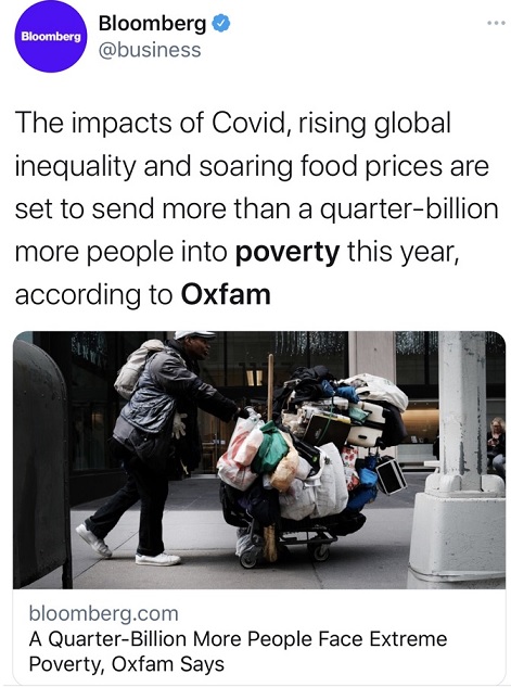 FX168财经报社(香港)讯 慈善组织乐施会国际(Oxfam International)周二(4月12日)发布报告称,由于新冠疫情的影响、全球不平等加剧以及乌克兰战争导致的食品价格飙升,预计今年全球将又有超过2.5亿人陷入极度贫困状态。