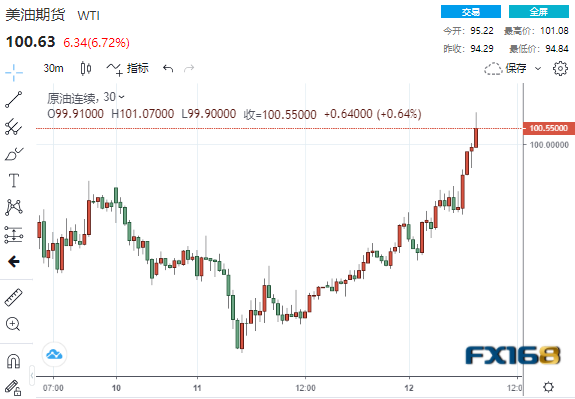 WTI原油日内暴涨超7%,高见101.08美元/桶;布伦特原油站上105美元/桶,日内大涨超7%。