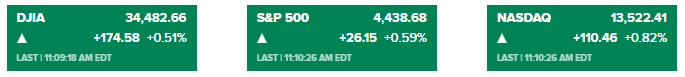 美股三大股指高开高走,道指现上涨超190点或0.5%,标普500指数上涨0.6%,纳指上涨1%。