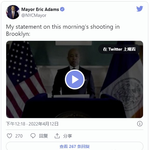 纽约市市长埃里克·亚当斯(Eric Adams)今天在视频声明中表示,他正在与纽约警察局和其他参与调查布鲁克林地铁枪击案的城市和州机构“不断沟通”。