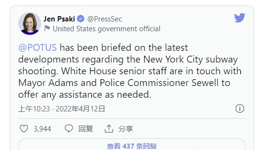 白宫新闻秘书珍·普萨基(Jen Psaki)在推特上表示,已向拜登总统通报了有关纽约市地铁枪击事件的最新进展。