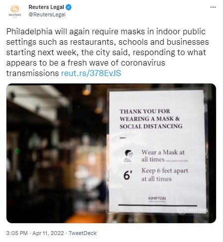 FX168财经报社(北美)讯 费城周一(4月11日)表示,从下周开始,该市将再次要求在餐厅、学校和企业等室内公共场所佩戴口罩,以应对新一波新冠病毒传播。
