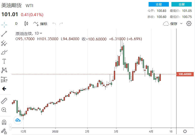 截至发稿,美国WTI原油期货上行5.80美元,涨幅6.10%,现报100.98美元/桶;布伦特原油期货上探5.36美元,涨幅5.40%,报104.71美元/桶。
