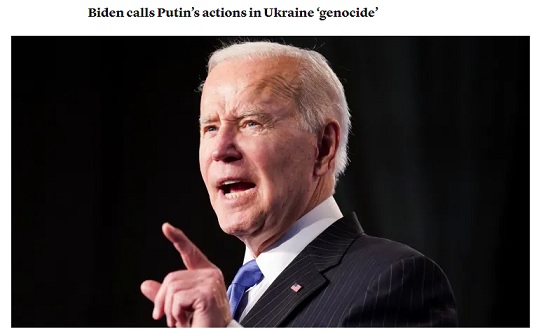 4月4日,拜登指责俄军在乌克兰布恰犯下 “战争罪”,并再次称呼普京为“战争犯”,呼吁对其进行审判,不过拜登当时并没有称此事件为“种族灭绝”。