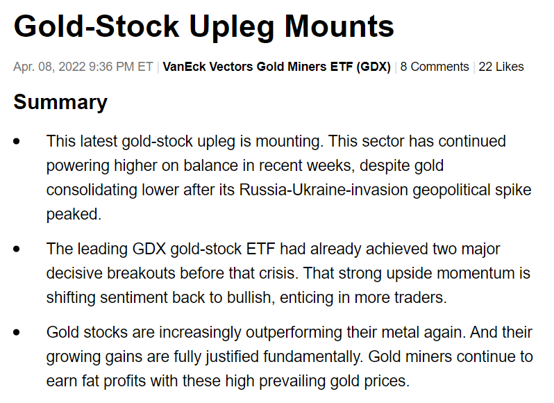 据市场专家提到,金矿股像是开槓杆的黄金交易,金价表现亮眼时,金矿股的股价往往涨更凶,但是金价下跌时,金矿股也会跌得更凶。Seeking Alpha报道称,美国3月份消费者物价指数(CPI)年增8.5%,创1981年来新高。Libertas Wealth Management的Adam Koos表示,火辣的通胀数据让黄金持续受惠,升息和美元转强似乎无法阻挡金价涨势。