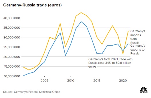 德国联邦统计局(Federal statistics Office)的数据显示,2021年德国和俄罗斯之间的贸易额同比大幅增长,商品价值飙升34.1%,至598亿欧元(合650亿美元)。