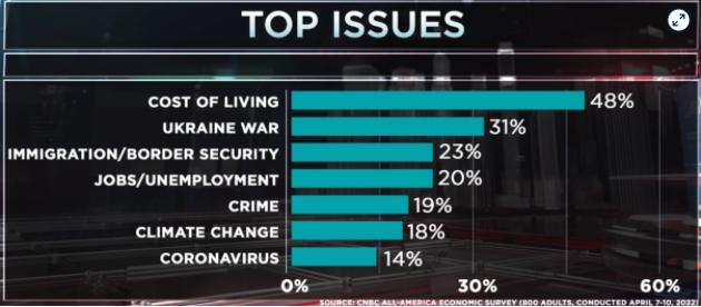 48%的参与者选择通货膨胀作为国家面临的最主要问题,比10月份上升了9个百分点。乌克兰战争以31%的得票率位居第二,其次是移民和边境安全、就业、犯罪和气候变化。不久前还是最重要的问题的新冠疫情现降至仅14%。