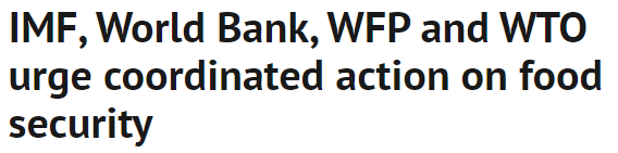 FX168财经报社(北美)讯 周三(4月13日),世界银行(World Bank)、国际货币基金组织(IMF)、联合国世界粮食计划署(WFP)和世界贸易组织(WTO)呼吁各国就粮食安全问题采取紧急协调行动,并呼吁各国避免禁止粮食或化肥出口。