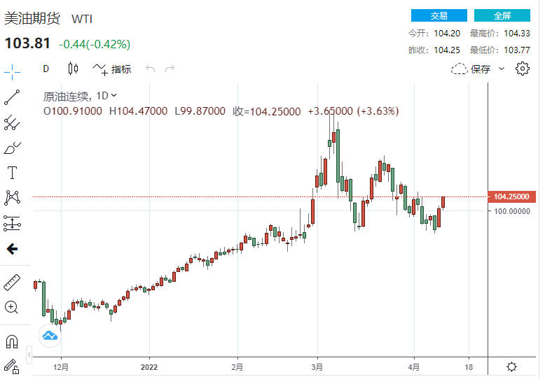 截至发稿,美国WTI原油期货上行3.17美元,涨幅3.14%,现报104.15美元/桶;布伦特原油期货上探3.81美元,涨幅3.63%,报108.66美元/桶。