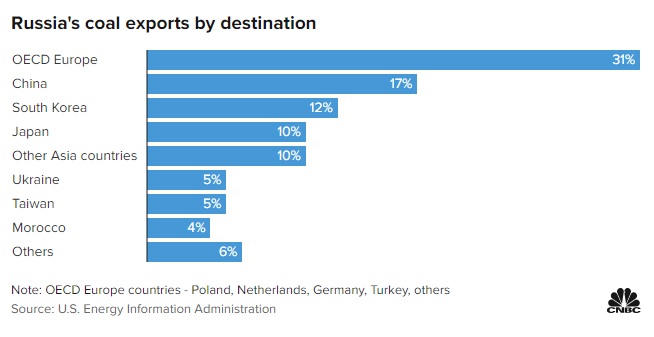 俄罗斯是世界上第六大煤炭生产国。据美国能源信息署(EIA)的数据,2020年,俄罗斯54%的煤炭出口到亚洲,约31%出口到经合组织(OECD)的欧洲国家。