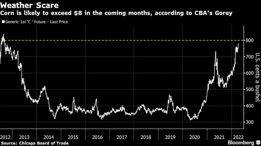 玉米价格涨向每蒲式耳8美元,因乌克兰战争威胁到该国的运输和播种能力,而寒冷的天气也加剧了对美国玉米种植开始缓慢的担忧。