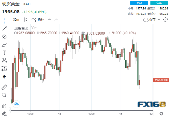 24K99讯 周四(4月14日)美市盘中,现货黄金从1980美元一线大幅回落20美元至1960.28美元低点,随后自低位有所反弹。风险偏好上升、美国国债收益率回升以及美元走强令这种非孽息金属承压。