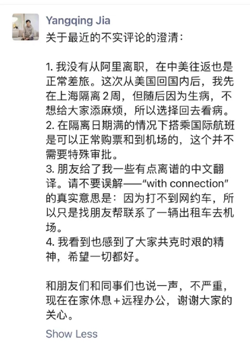 1. 我没有从阿里离职,在中美往返也是正常差旅。这次从美国回国内后,我先在上海隔离2周,但随后因为生病,不想给大家添麻烦,所以选择回去看病。
