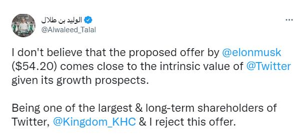 他发推称,“考虑到推特的增长前景,我认为,马斯克的54.2美元收购价提议并未接近推特的内在价值。作为推特的最大长线股东之一,我和我的投资公司Kingdom Holding Company (KHC)拒绝这一提议。”