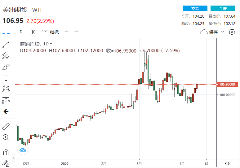 截至发稿,美国WTI原油期货上行2.33美元,涨幅2.24%,现报106.47美元/桶;布伦特原油期货上探2.55美元,涨幅2.34%,报111.34美元/桶。两份原油基准合约均在4月份录得首周涨幅。几周来,价格一直是2020年6月以来波动最大的。