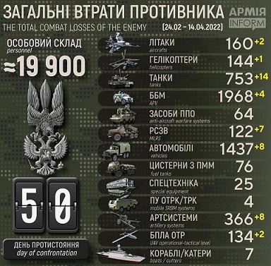 乌克兰武装部队总参谋部4月14日公布的俄军折损报告指出,截至14日,俄军已损失兵力1万9900人。