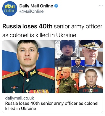 据英国《每日邮报》报道,自俄罗斯-乌克兰战争开始以来,俄罗斯已经失去了40名高级军官。