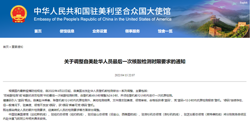 根据外交部要求,自2022年4月22日起,自美国出发赴华人员登机前检测再次做出一系列调整。主要包括: