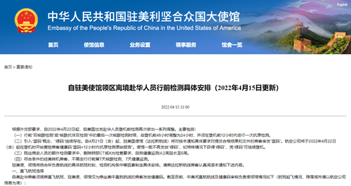 此外,中国还发布了自驻美使馆领区离境赴华人员行前检测具体安排。具体如下: