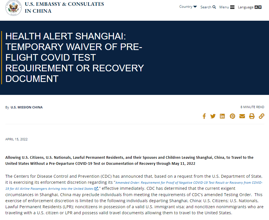 FX168财经报社(北美)讯 周五(4月15日),美国疾病控制与预防中心(CDC)宣布,鉴于上海当前的紧急情况,应美国国务院的要求,所有美国公民(U.S. Citizens)、美国国民(U.S. Nationals)、合法永久居民等离开上海到美国时,无需提供之前要求的起飞前核酸检测。即日起生效,到5月11日结束,也可能延期。
