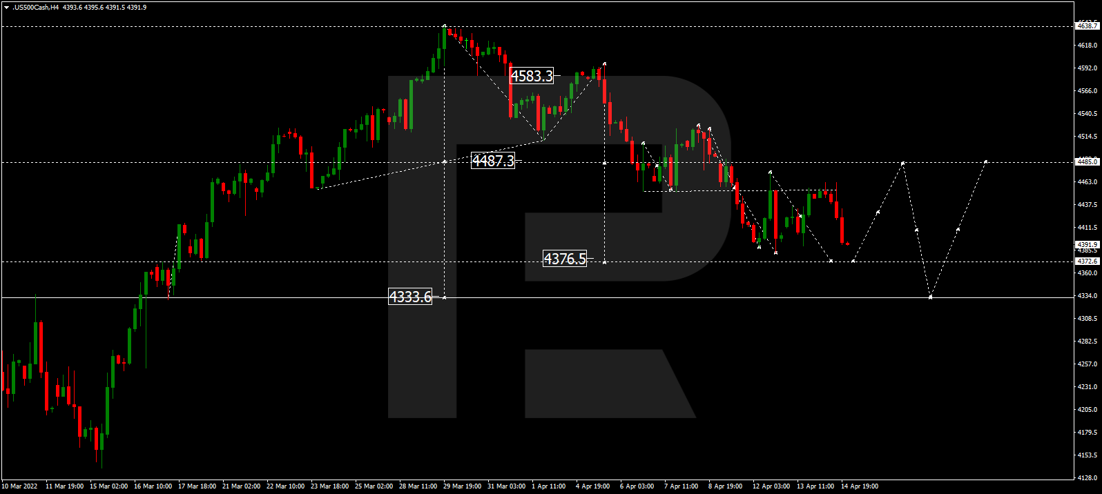 标普500指数继续跌向4372.5点。之后,该指数可能会回升至4485.0点,然后恢复下行倾向,届时的第一个目标为4333.3点。