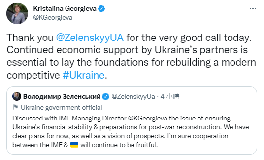 乌克兰总统泽连斯基表示,他曾与格奥尔基耶娃讨论过“确保乌克兰金融稳定和为战后重建做准备的问题”。本周早些时候,国际货币基金组织表示:“我们正在为所需的大规模重建工作做准备。”格奥尔基耶娃此前曾警告说,这场战争可能会破坏全球经济从新冠危机中复苏。