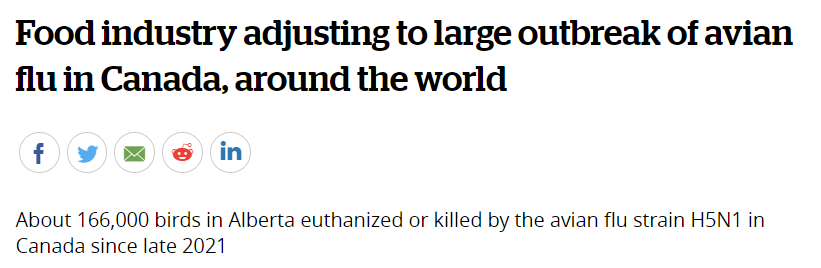 加拿大食品检验局表示,2022年的禽流感形势是前所未见的一年。亚省、安省、新斯科舍省和纽芬兰省迄今都已发现高致病性禽流感菌株H5N1,全国已有约26万只禽鸟因禽流感病死或被安乐死。